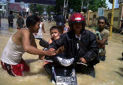 MEDAN: Beribu-ribu buah rumah, sekolah dan pusat kesihatan masyarakat dan masjid di sembilan kawasan di Medan, Sumatera Utara ditenggelami air selepas dilanda banjir kilat semalam.Paras air yang naik secara mendadak menyebabkan ratusan ribu penduduk yang tidak bersedia terpaksa melarikan diri ke tempat lebih tinggi, pusat perlindungan sementara dan kawasan tidak terjejas banjir, sebilangan besar mereka hanya sehelai sepinggang. Namun tiada kemalangan jiwa dilaporkan setakat ini.